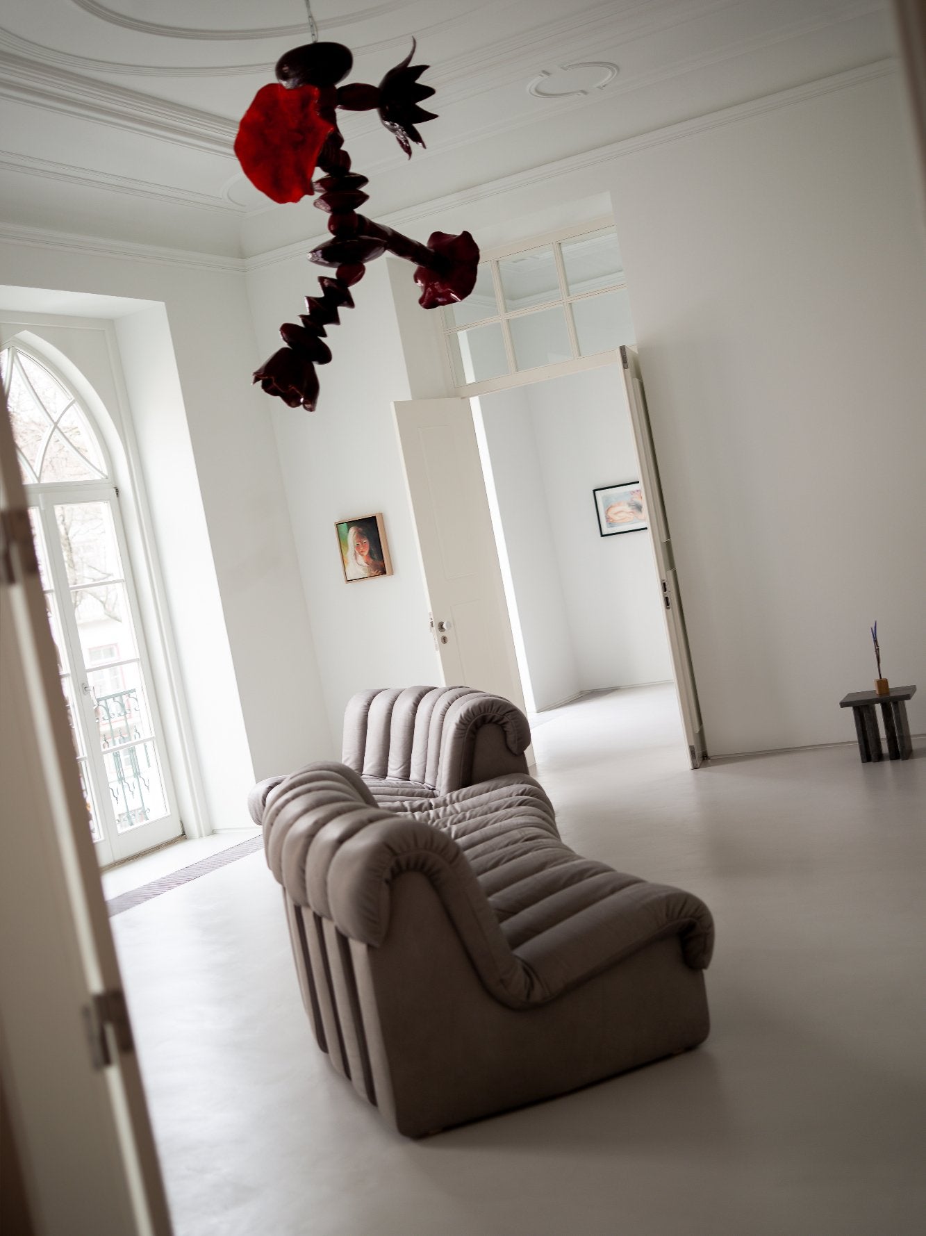 Also celebrating body positivity, as well as LGBTQ+ identities, is Nadine Faraj whose watercolors feature abstracted figures with fluid, washy brushstrokes and colors that seem to melt into one another. Often shown with tender expressions and in poses that suggest charged moments that range from pleasure to angst, Faraj’s paintings exude emotion. Similarly abstracted bodies appear in Ethel Coppieters’s painting Never Alone (2023) in which jumbled arms reach towards a nude figure who looks at the viewer. With a soft, yet indifferent expression, the figure seems almost detached, as if lost in distant thoughts. The title is both comforting and foreboding, a reminder of the juxtapositions inherent in our hyper-connected, yet deeply impersonal, 21st century society.